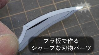 プラ板で刃物状もパーツを作るときに使える、刃付け形状を削り出す方法について紹介しています。驚くテクニックなどはなく力技なところがありますが、やってみると意外とできるので是非見てみてください。