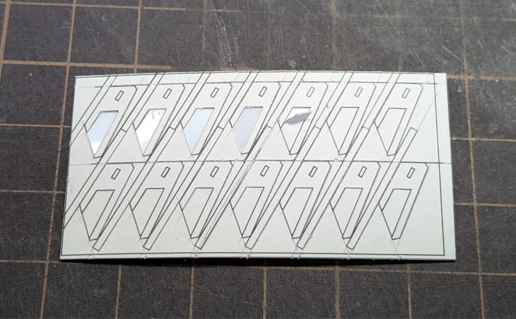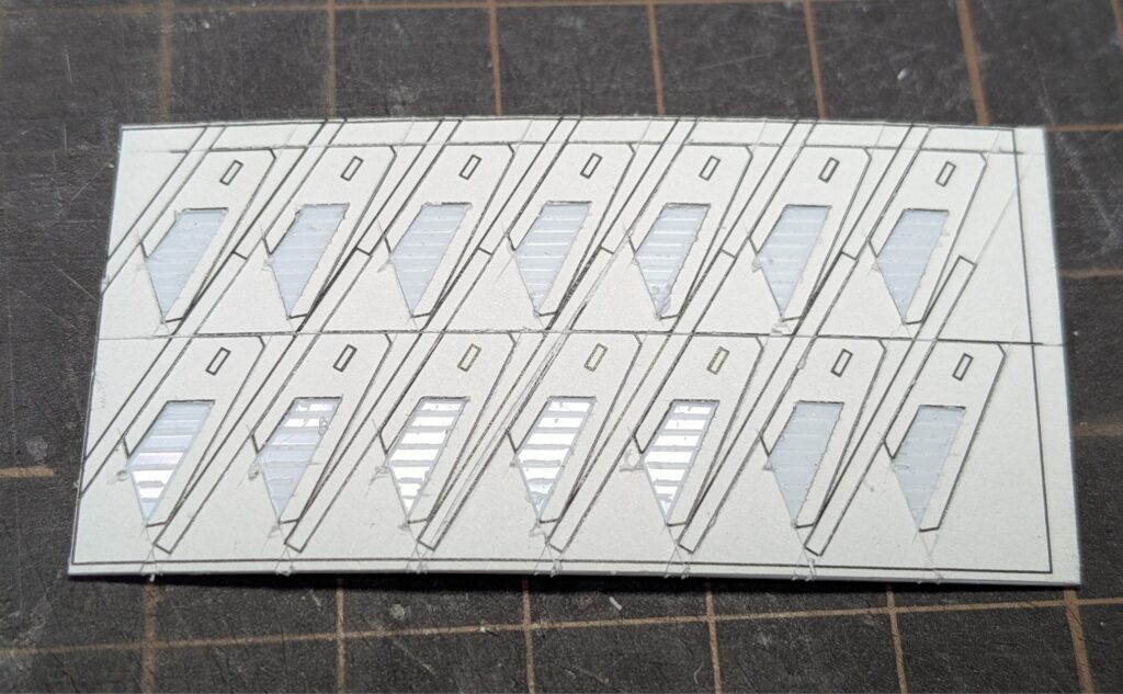 図面を印刷してプラ板に貼り付けた後、最初に外形をカットし、次にフィン状のディテールを入れたい部分のみ図面をはがしました。
