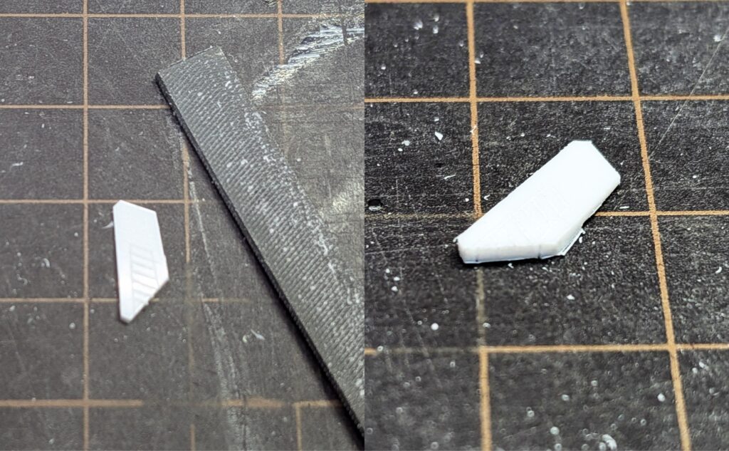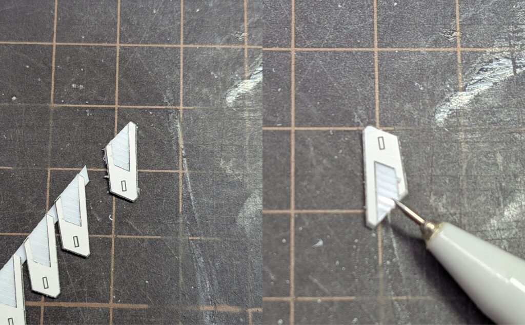 接着剤が乾いたら部品ごとに切り離し、スジボリを調整します。