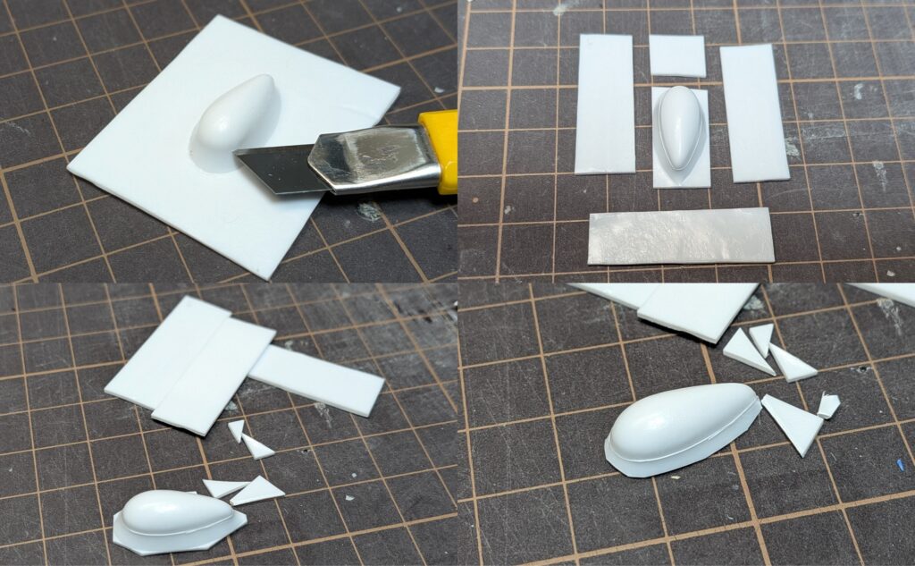 (右上) 削り出す斜面に合わせてプラ板を削ります