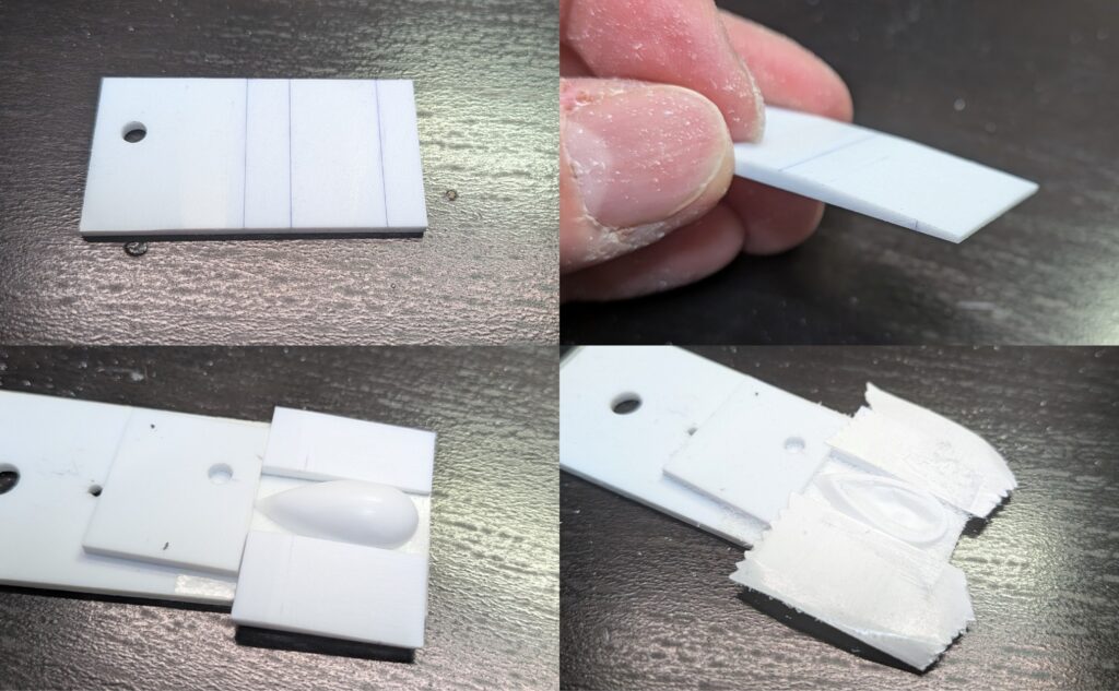 (左上) 切り出し時に不意に割れてしまわないように、部品から離れた位置で切れ込みを入れておきます。