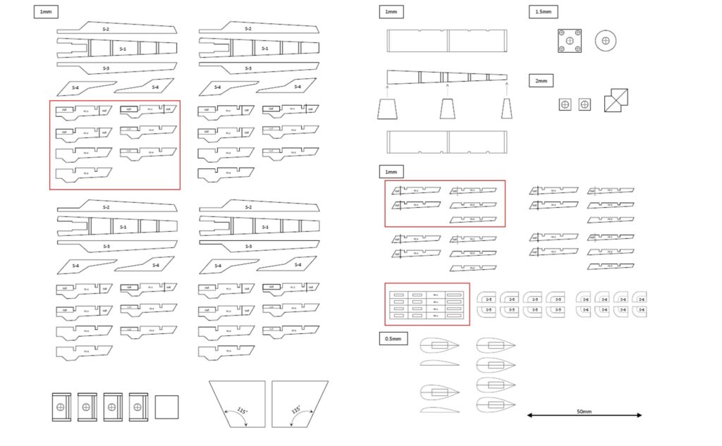 今回は赤で囲った図面部分を使って製作しています。スラスターフィンは1セットのみ囲っているので、複数個ある部品は同じ形状の部分を切り出して使ってください。