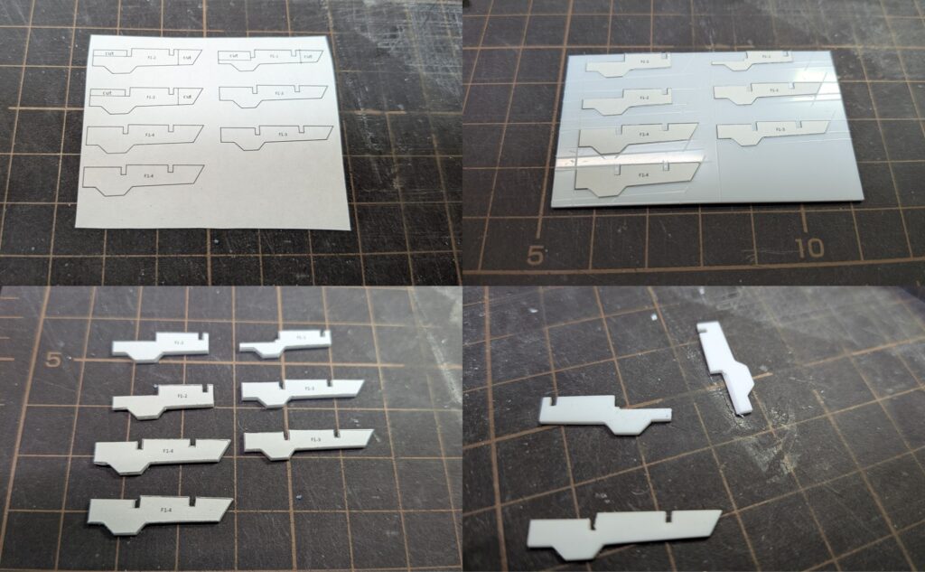 こちらは設計時は0.5mmで作成するつもりで図面を書きましたが、大型フィンとフィンの厚みが異なるのはかっこ悪い気がして急遽1mmプラ板で作成することにしました。