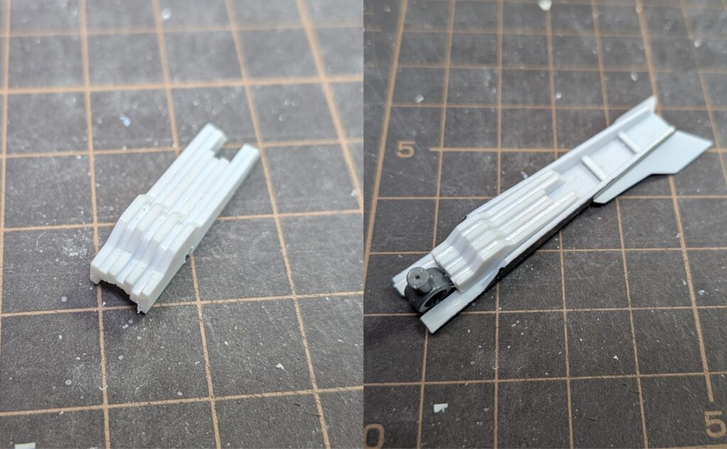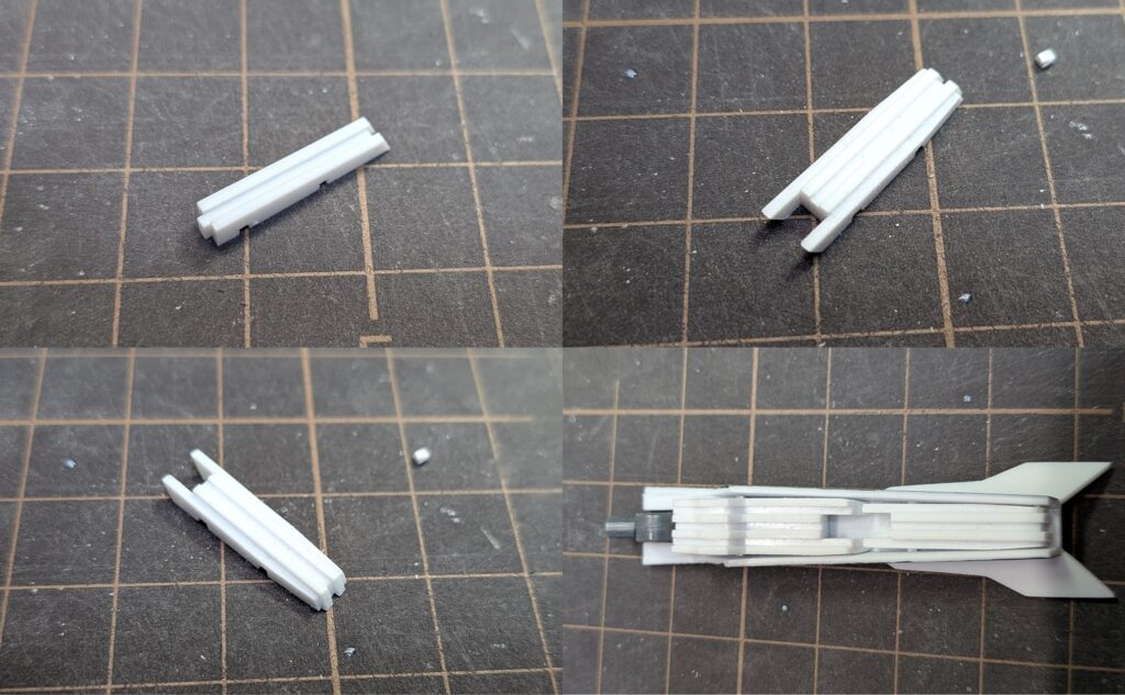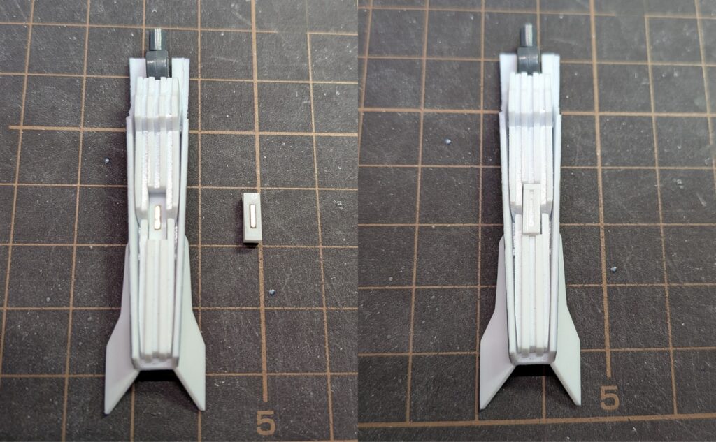 折りたたむ際のヒンジと折りたたんだ際のスラスターとして、設定上はフィン中央に長方形の形状があるのでそれを再現します。