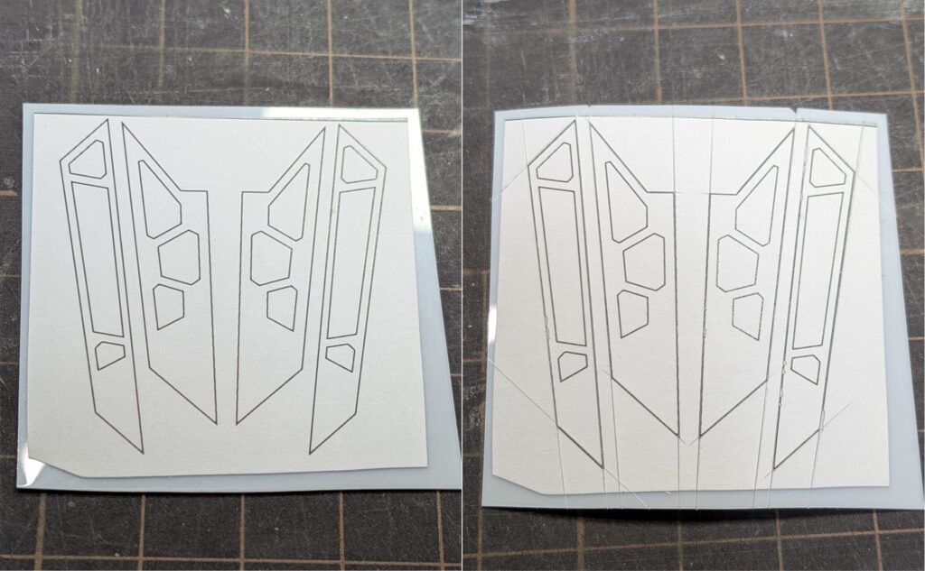 (左) Powerpointで作成した図形をA4サイズで印刷し、プラ板に貼り付けます。